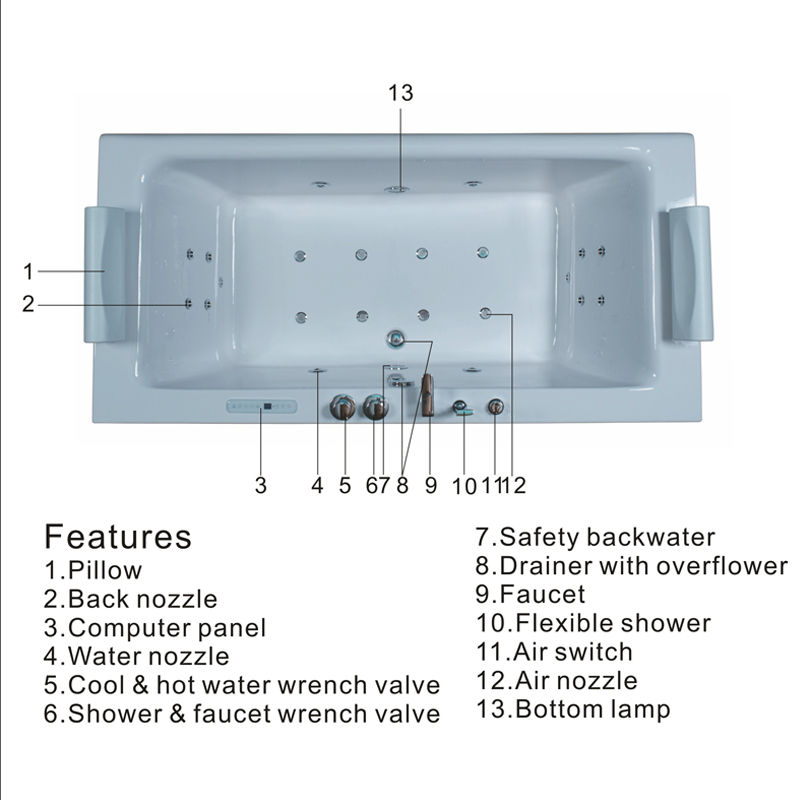 組件:浴缸,裙板,透明玻璃,電機(jī),水位檢測器,去水,冷熱水閥,普通水龍頭和調(diào)節(jié)閥,空氣調(diào)節(jié),瀑布出水口/水龍頭,活動花灑,回水,水嘴,枕頭,底燈,控制面板,音響。