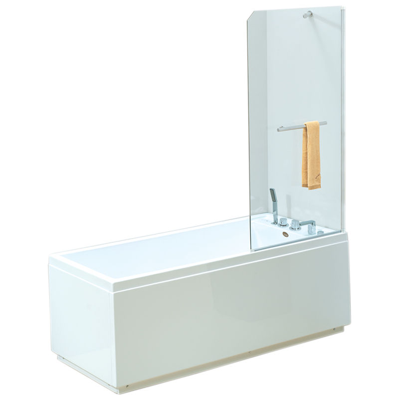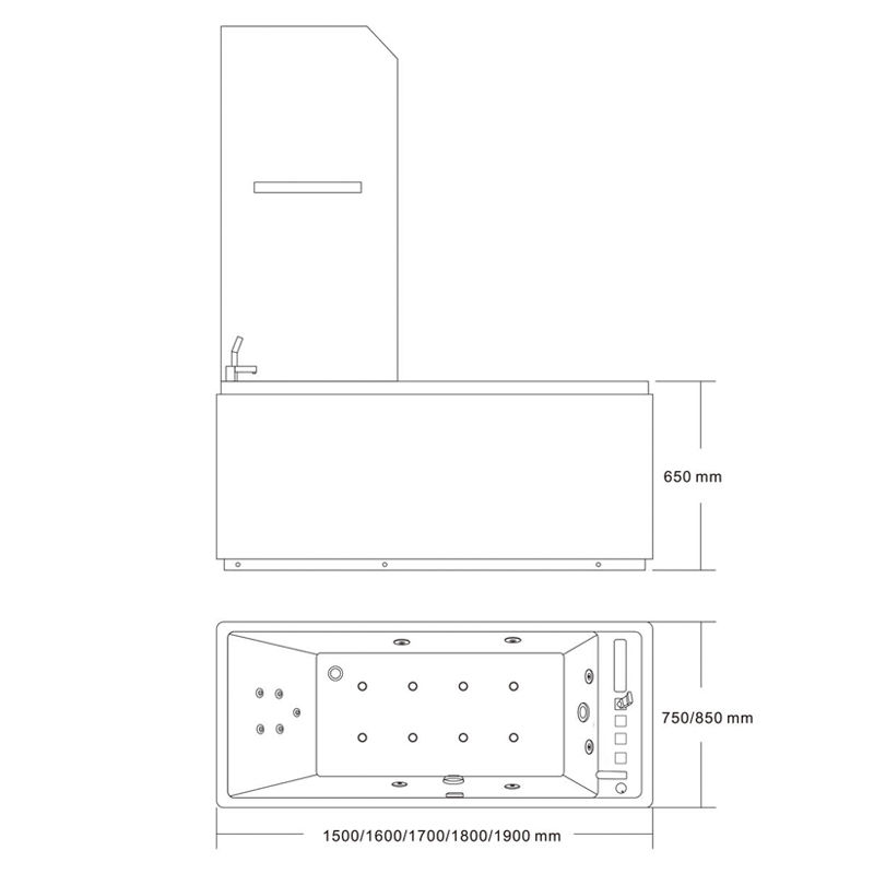Components: Bathtub, Apron, Transparent glass, Motor, Air blower, Water level detector, Drainage, Cool & Hot water wrench, Normal Faucet & Shower wrench valve, Air adjustor, Waterfall inlet/faucet, Flexible shower, Backwater, Water nozzle, Air nozzles, Pillow, Bottom lamp, Control panel, Speaker.