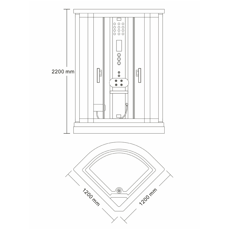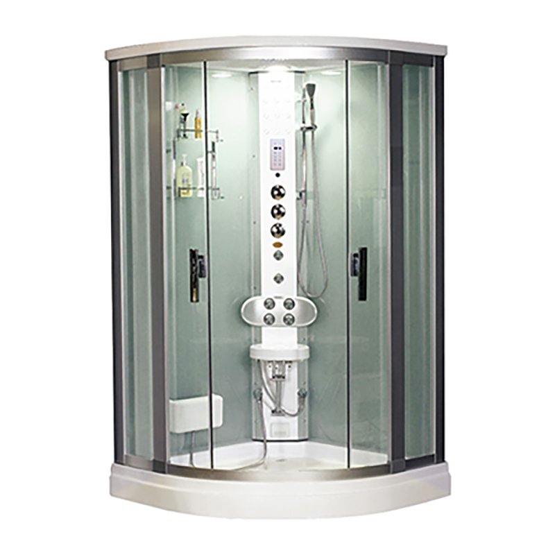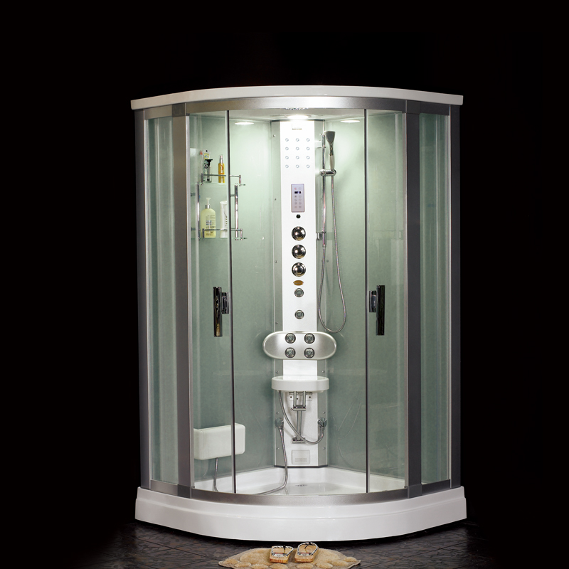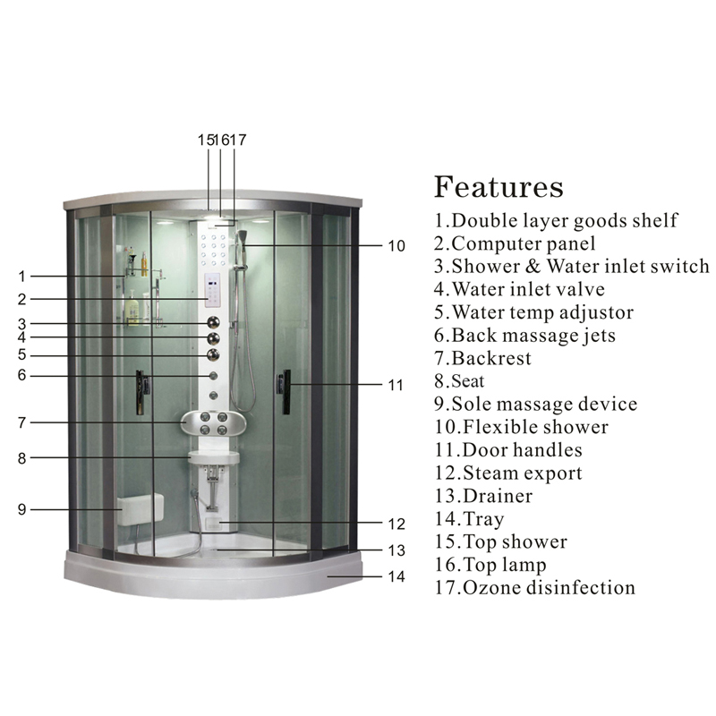 WITH:Cell drainer,silent double slider,2 door handles,double layergoods shelf,top showr,lifter,shower,shower hose,faucet,6 atomization jets,backrest,fixed seat,sole massage,computer,ozone,top lamp,speaker,fan, 4 bead background lamp,steam export