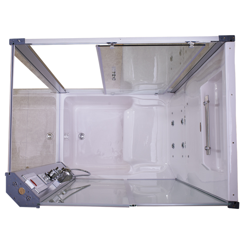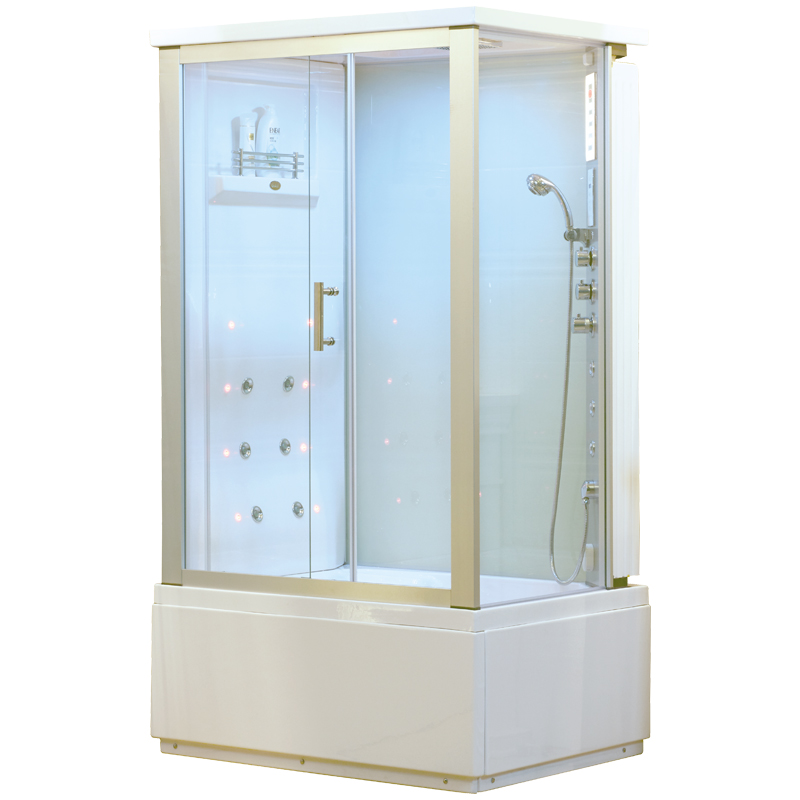 WITH:Pop-up drainer with overflow valve,silent double slider,door handle,good shelf,top shower,shower holder,shower,shower hose,shower joint ,faucet,6 atomization jets,computer,ozone,top lamp,fan,speaker,lamp panel,8 small colorful lights,steam export